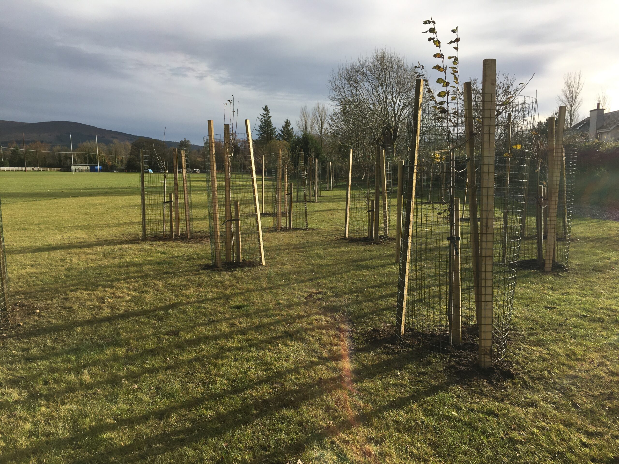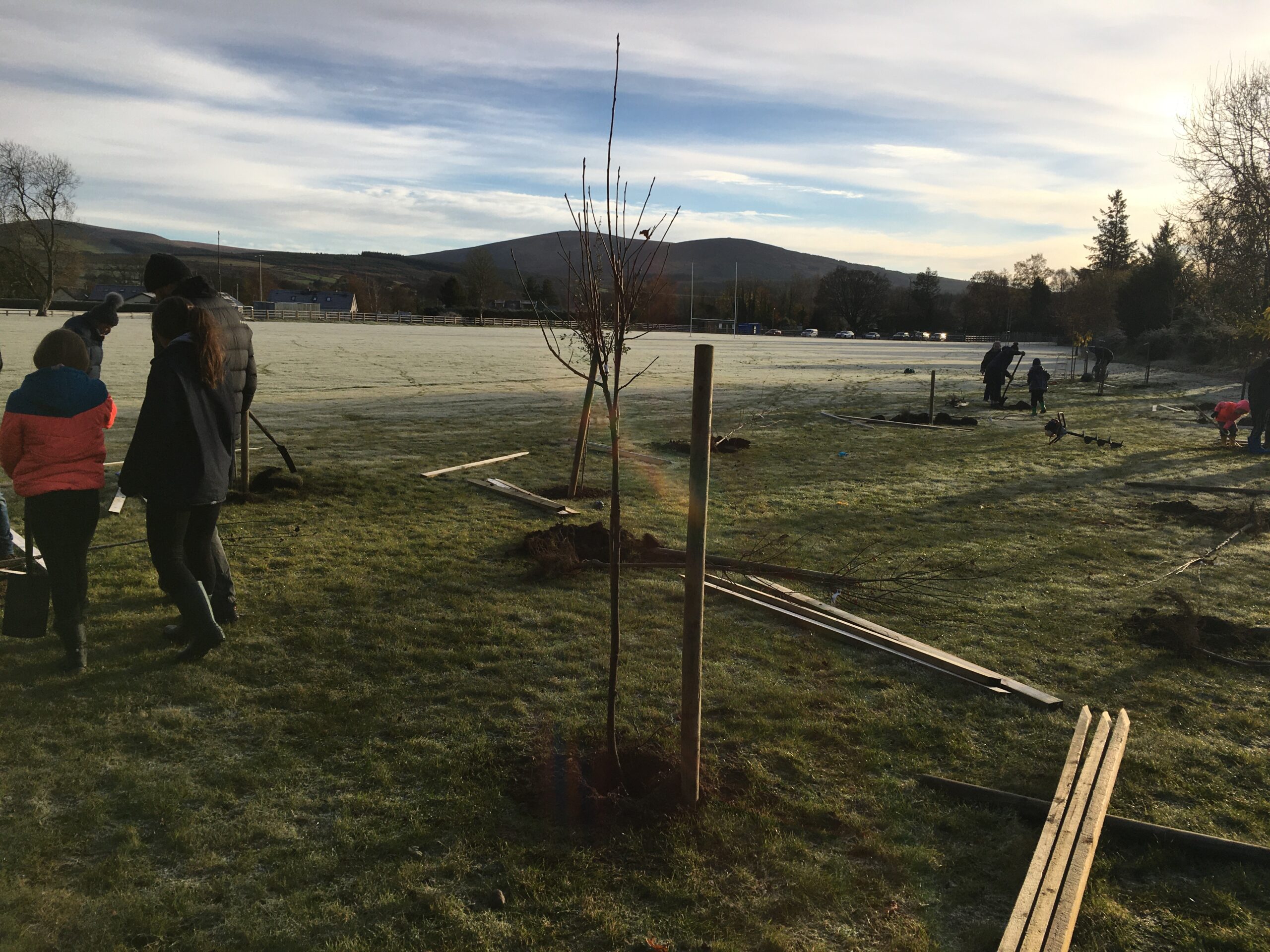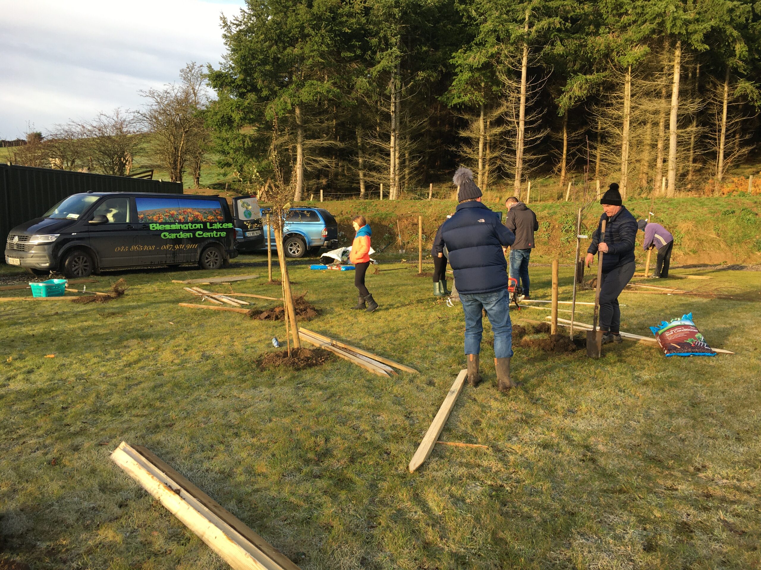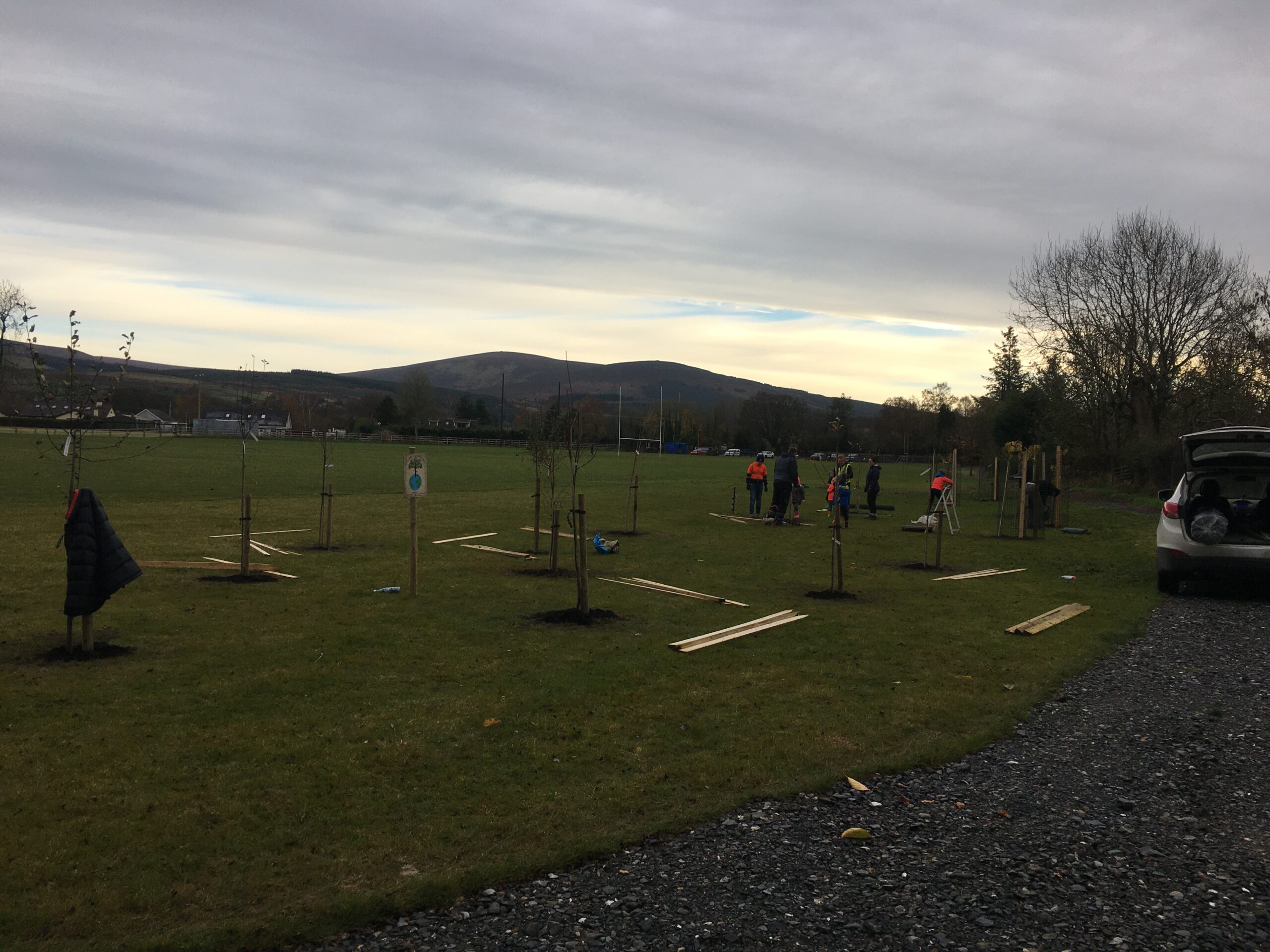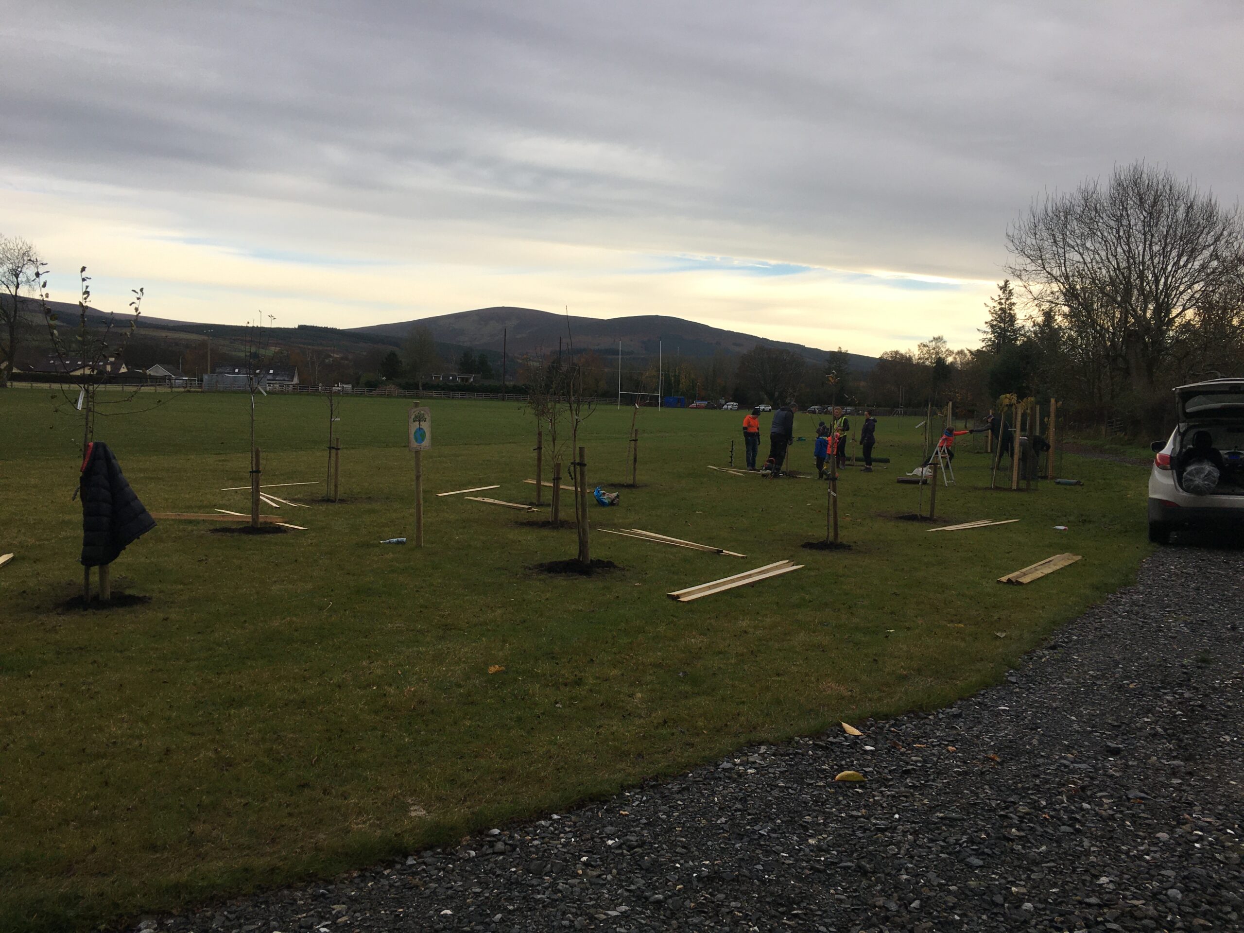 As you may be aware the Club received a 500 euro grant to plant trees from Wicklow County Council, which was great.  And so, we engaged Catriona Taylor at Blessington Lakes Garden Centre who acted not only as tree supplier but a consultant who also managed to bring along the crew from Bugs, Bees & (Native) Trees, thank you to Dr David Mulcahy.