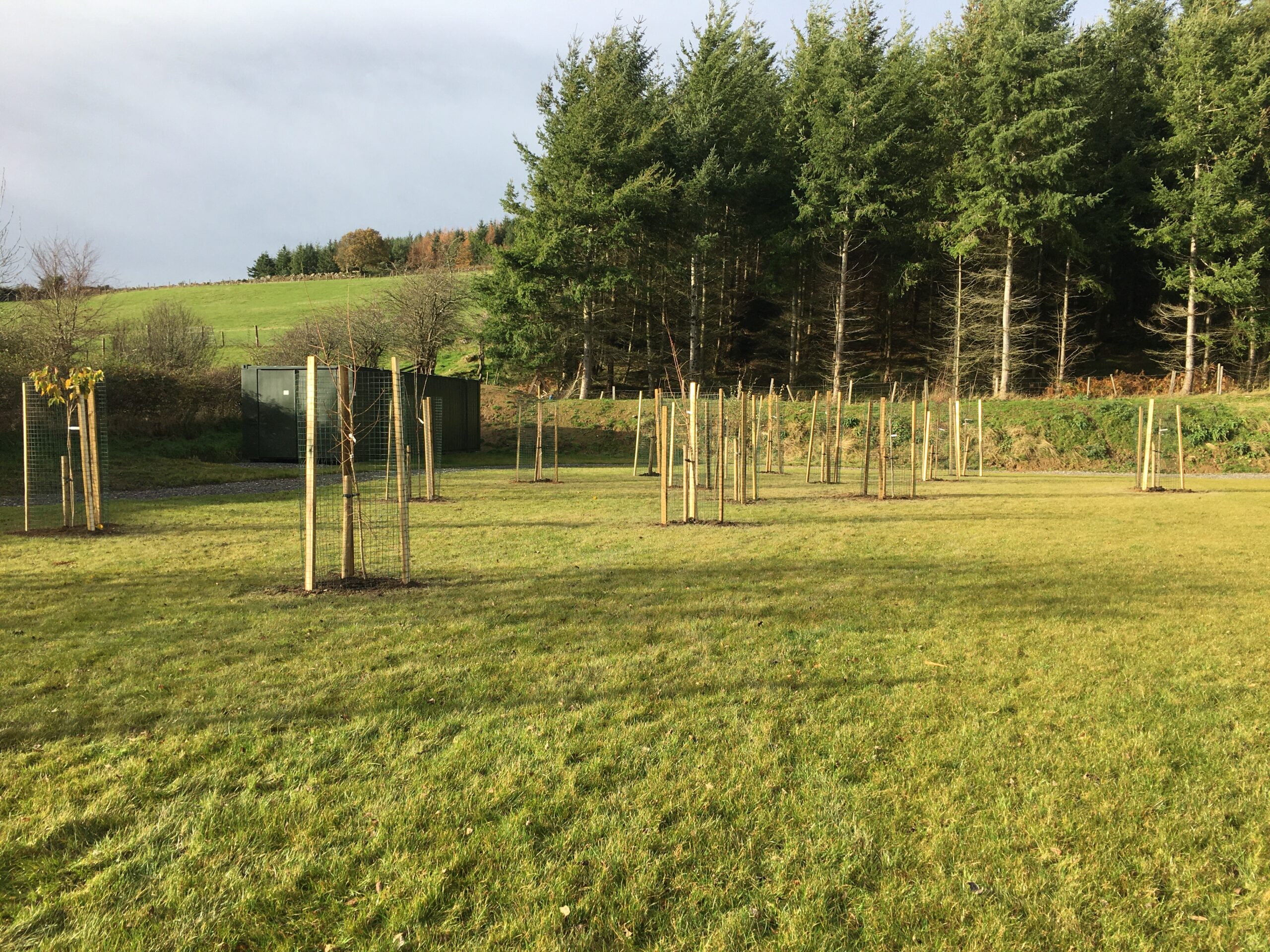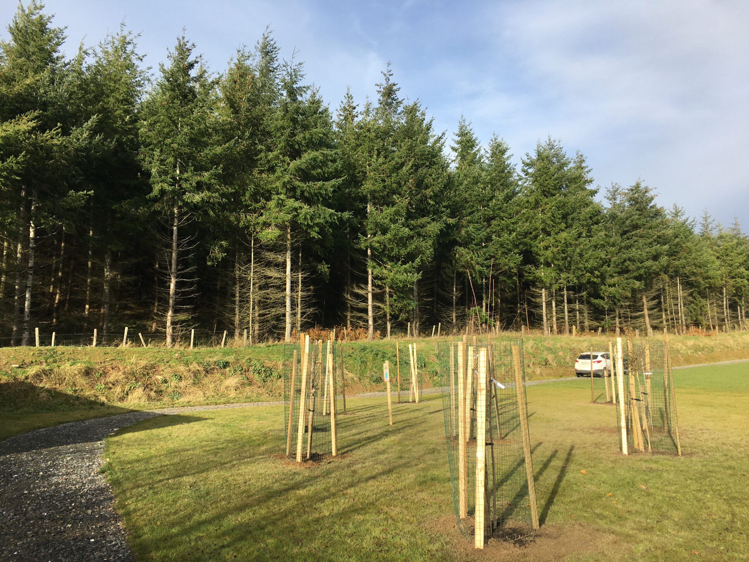 If anyone is wondering, the trees have to be protected from the deer, so, each tree had to be deer fenced, which more than doubled the cost of the project, unfortunate but necessary.