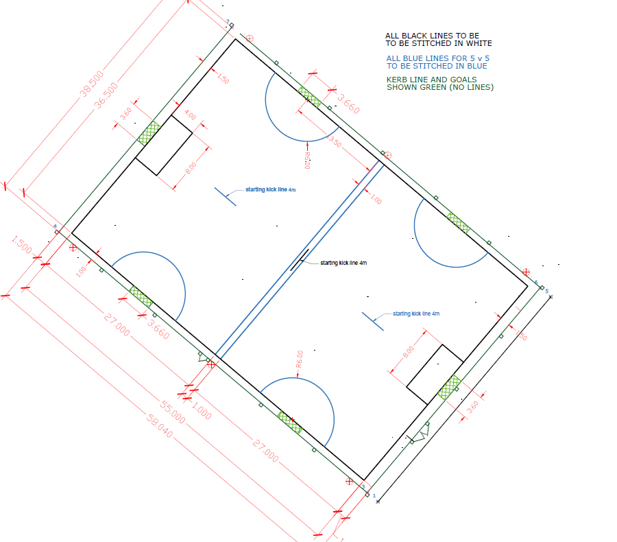 The facility is made up of two full size 5 a side pitches and one bigger pitch – 58.5 metres x 38 metres. All three sets of goals are retractable.