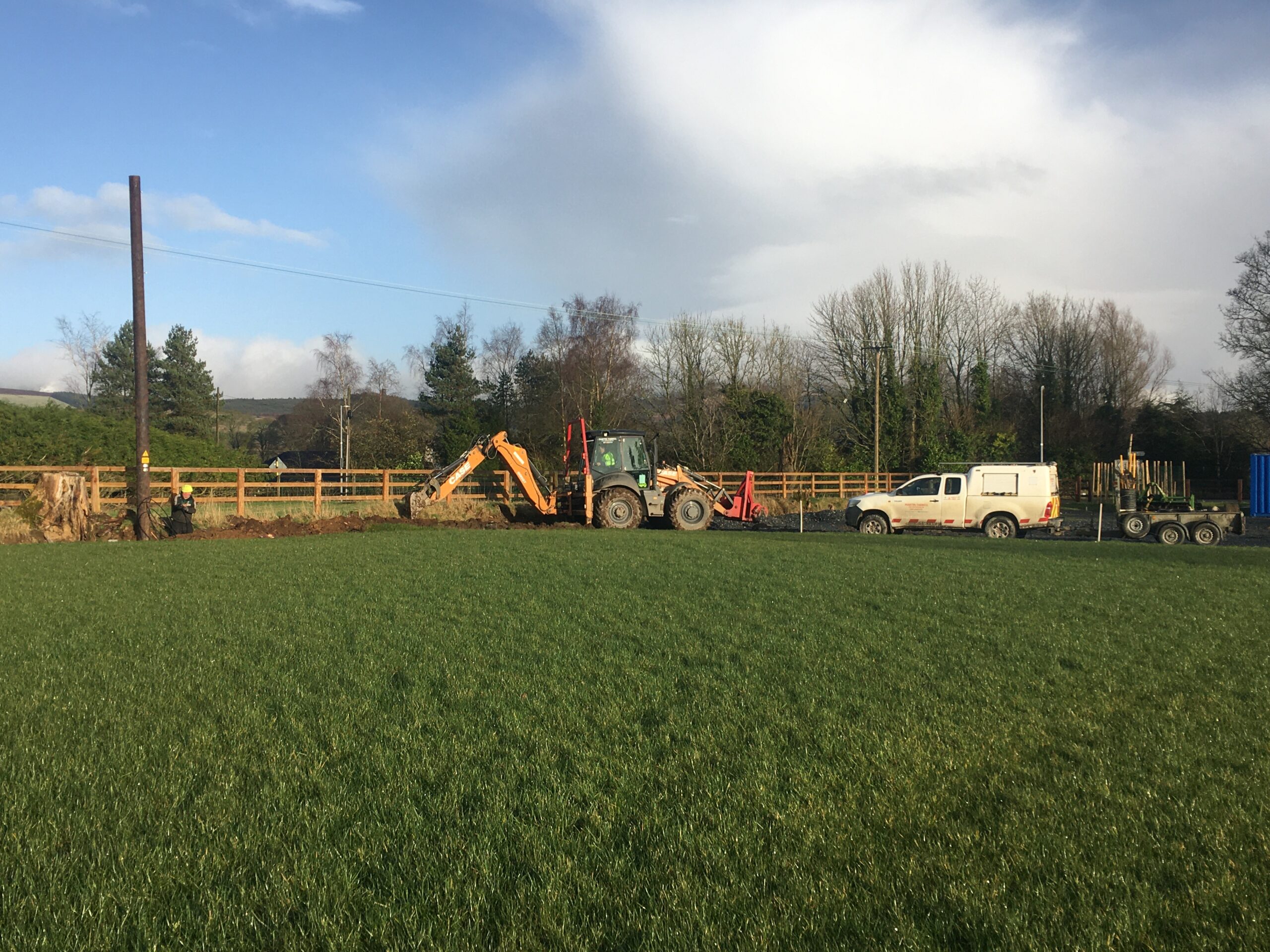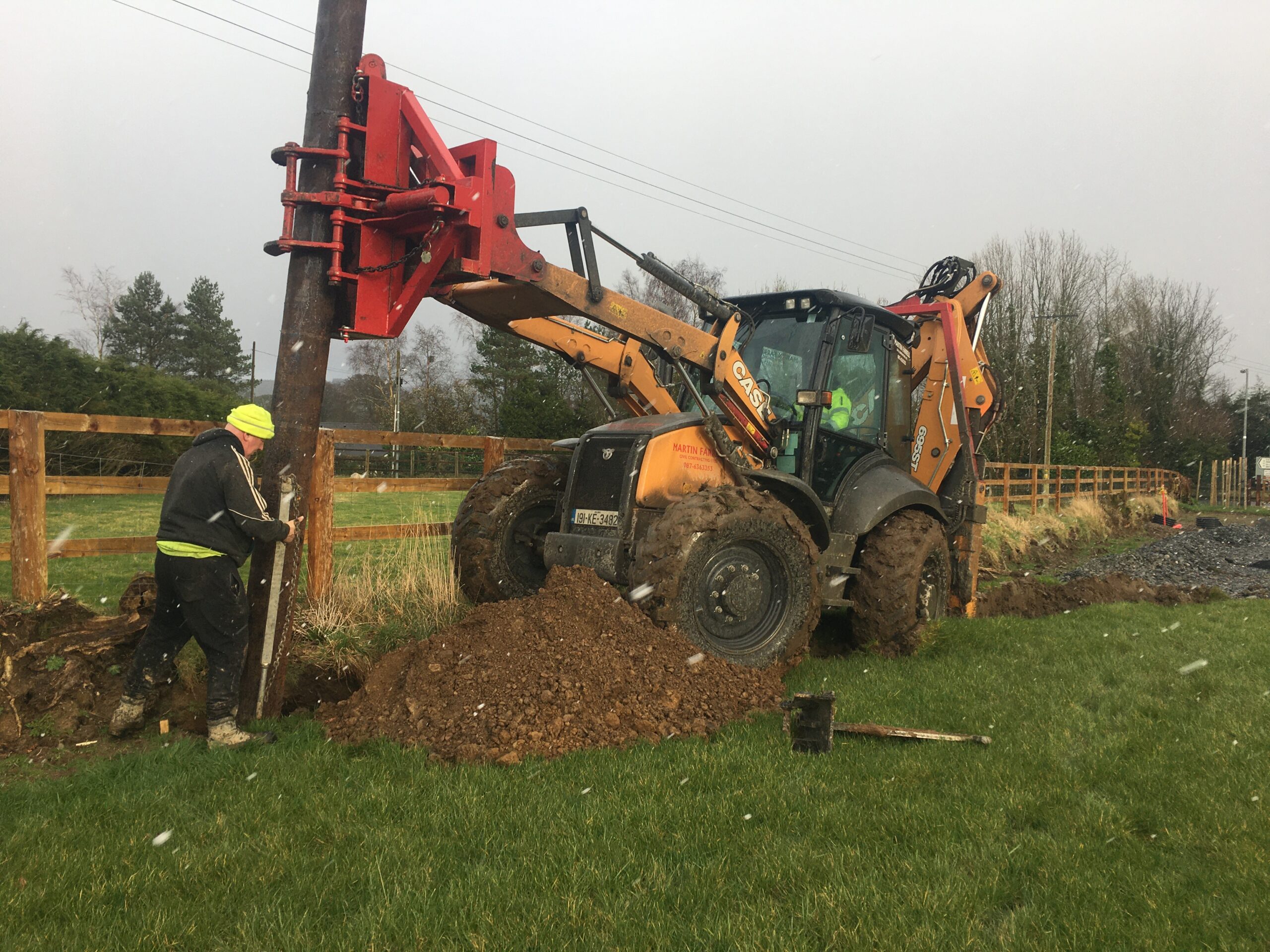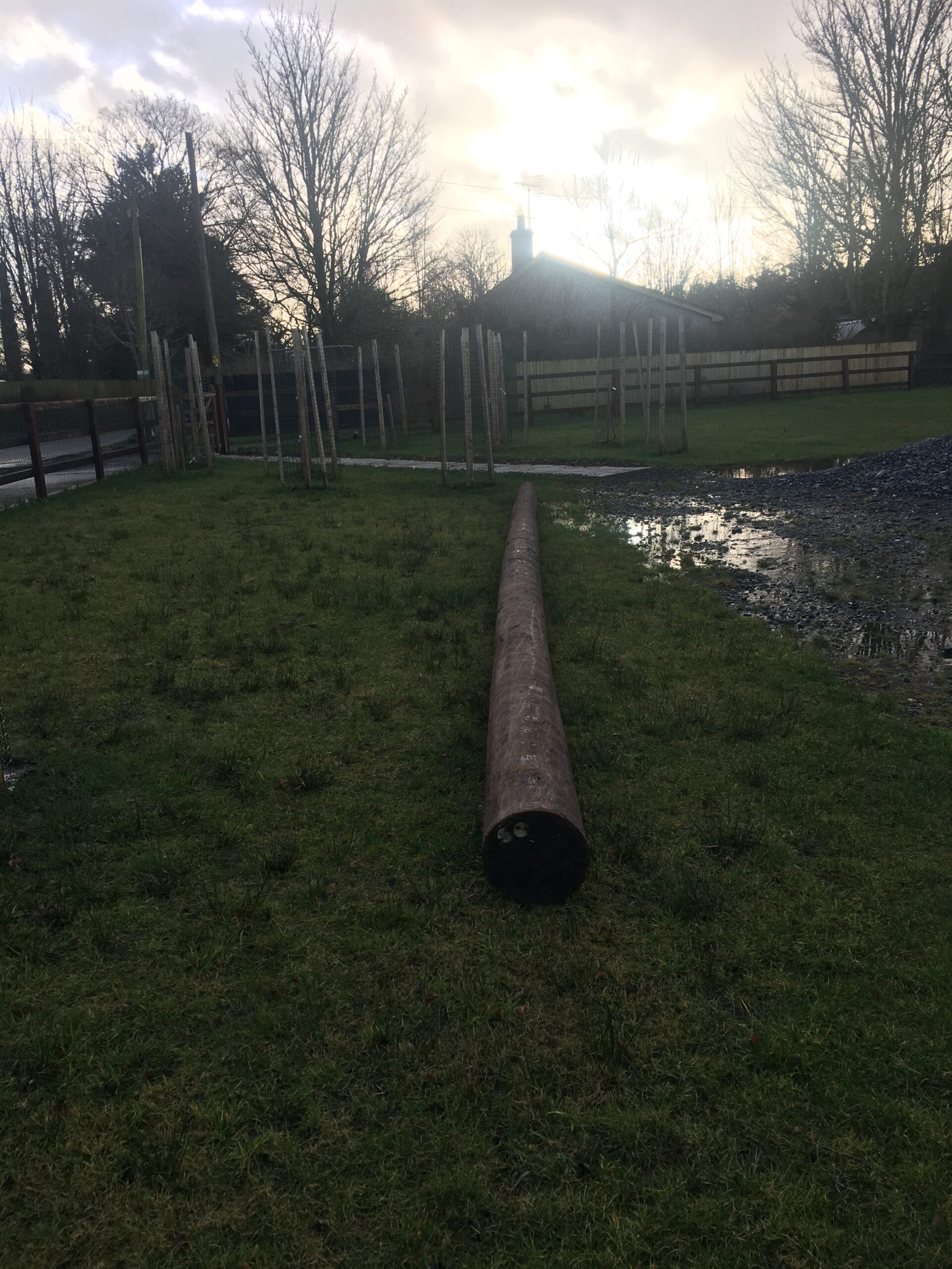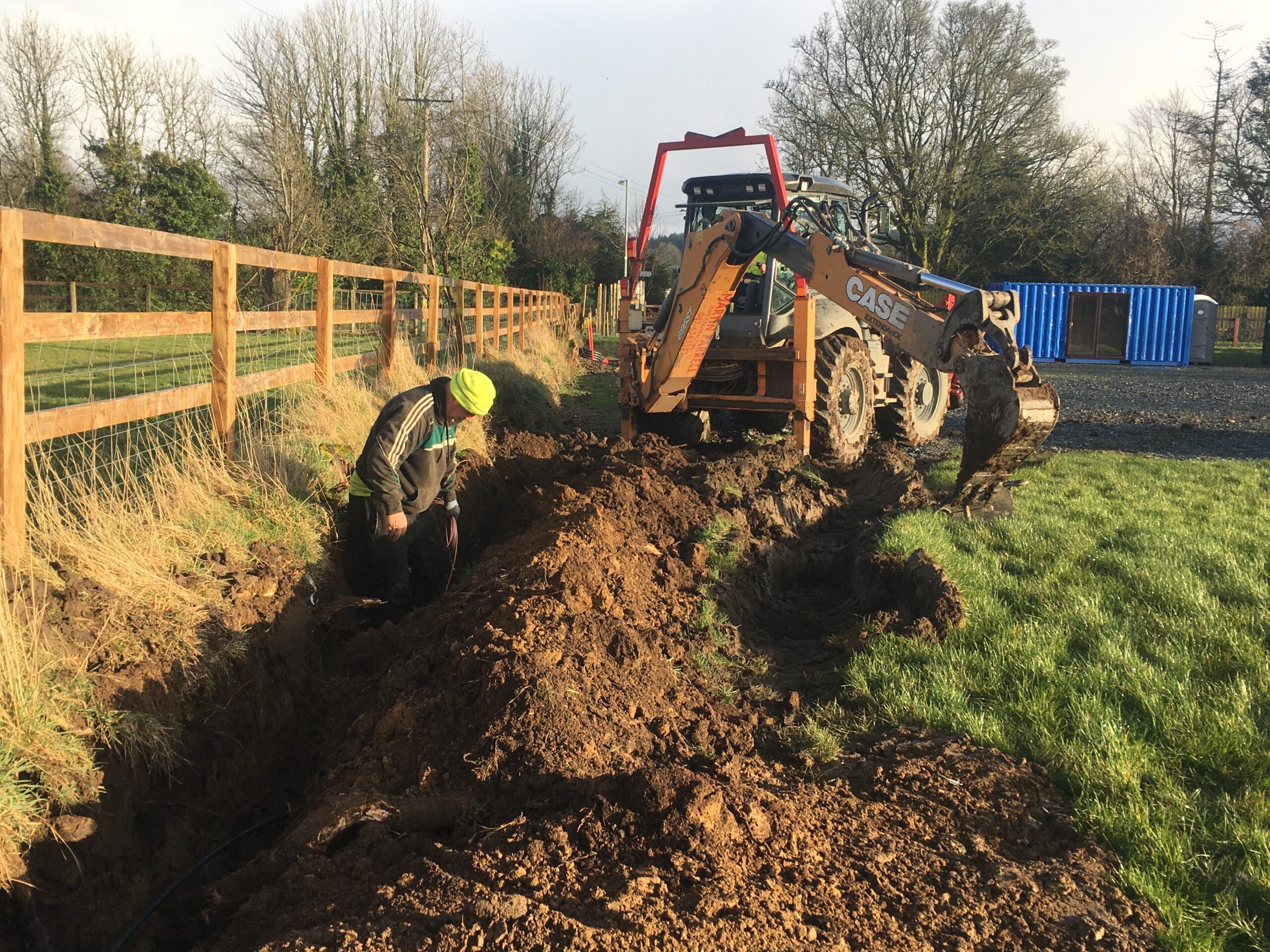 And the ESB Pole has been grounded…photos below…power should be in by May when the walking track, car park fencing (with two pedestrian gates) and final touches on the boundary of the site are completed…exciting times ahead. FYI, the two units (coffee/tea unit and dressing rooms) on site at the moment will move to the right hand side of the car park once the car park is completed in May.