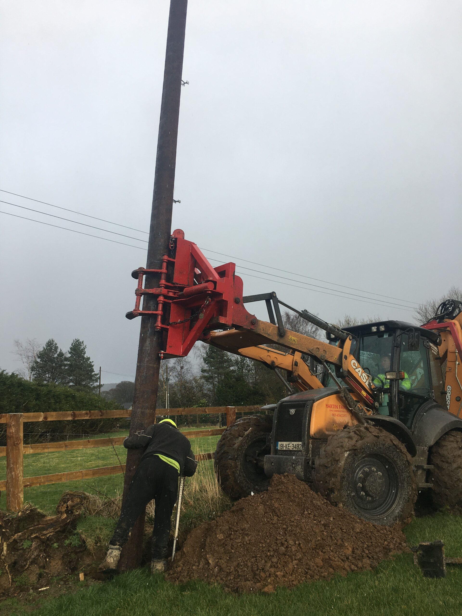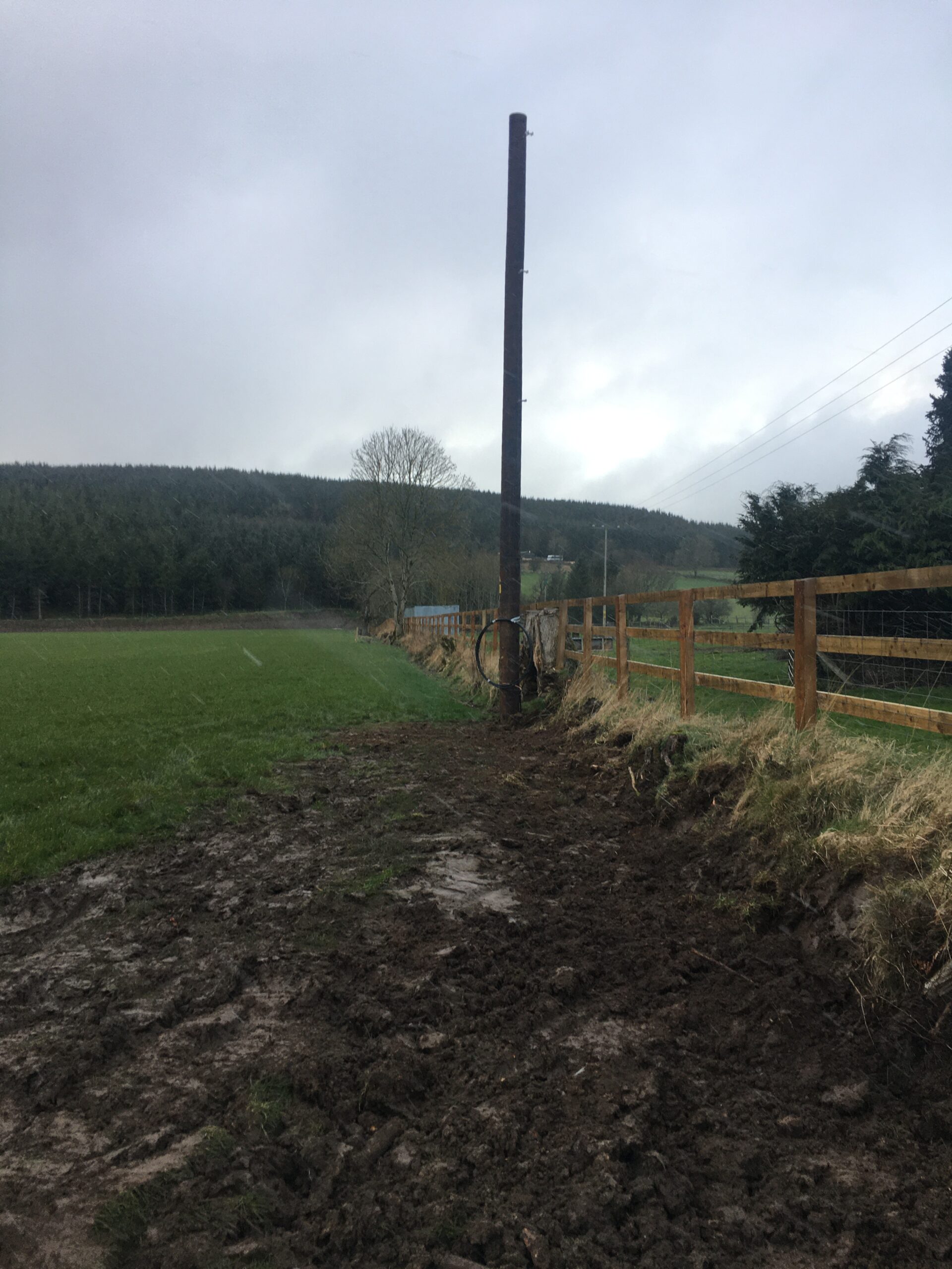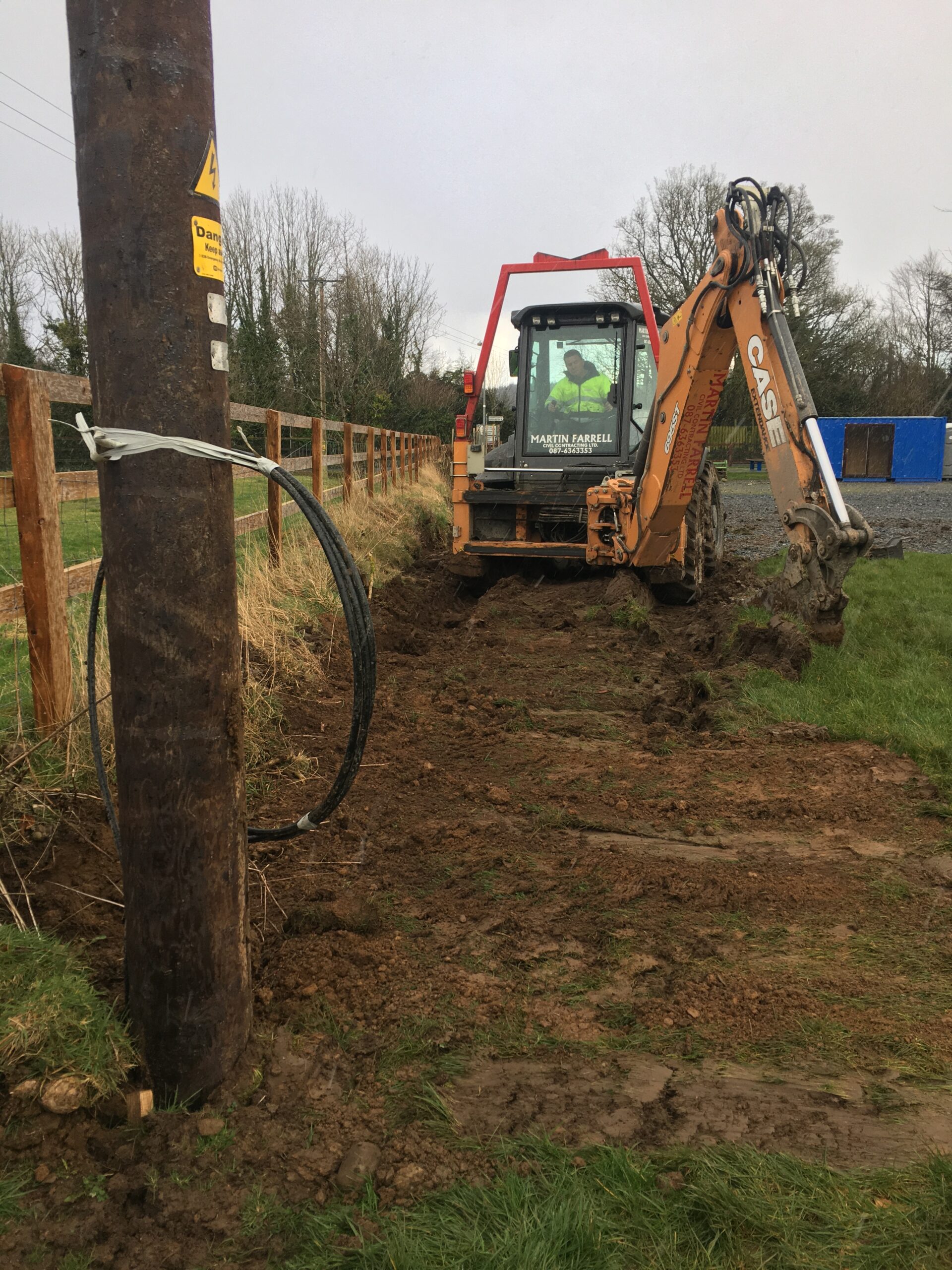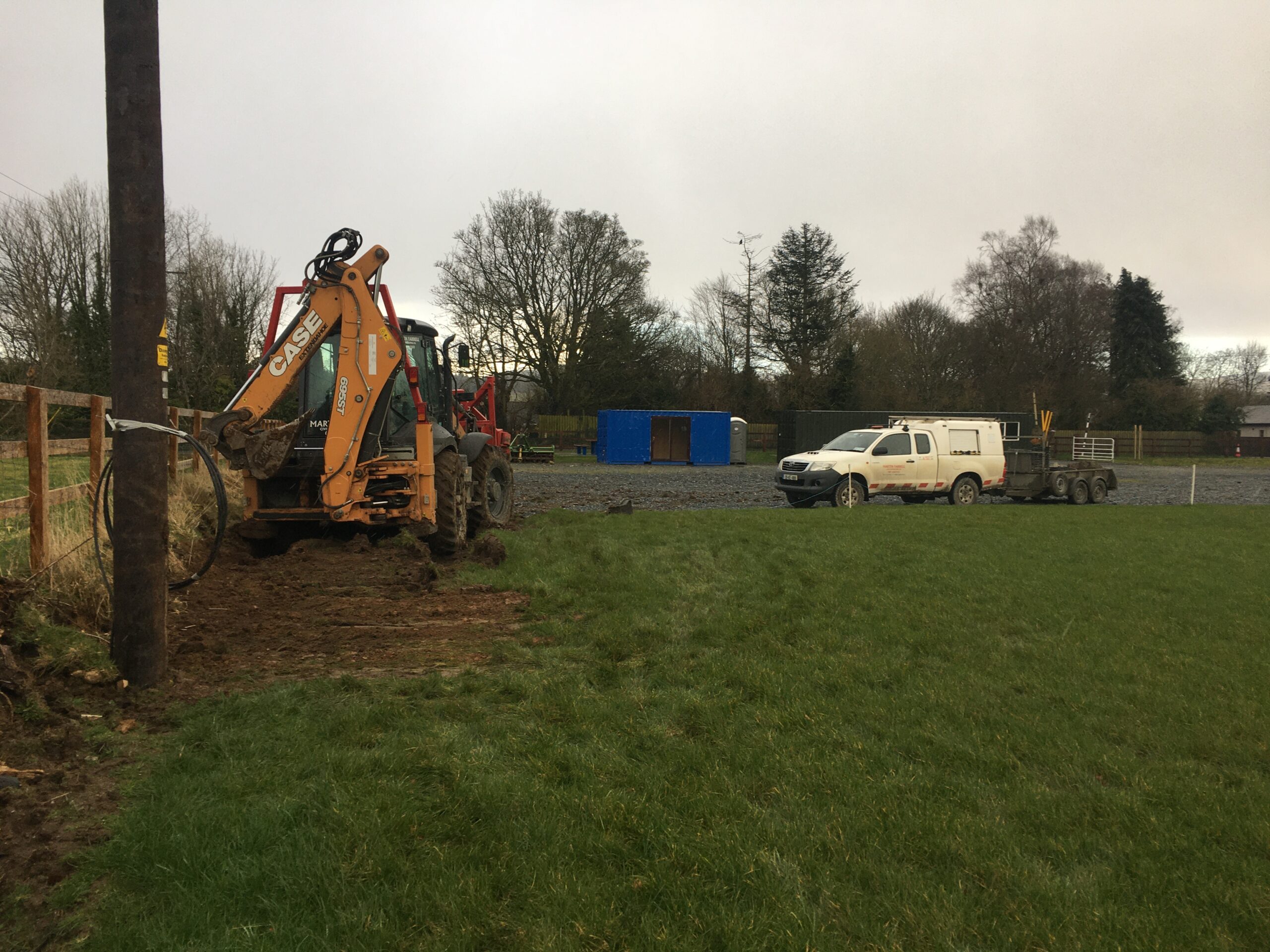 And the ESB Pole has been grounded…photos below…power should be in by May when the walking track, car park fencing (with two pedestrian gates) and final touches on the boundary of the site are completed…exciting times ahead. FYI, the two units (coffee/tea unit and dressing rooms) on site at the moment will move to the right hand side of the car park once the car park is completed in May.
