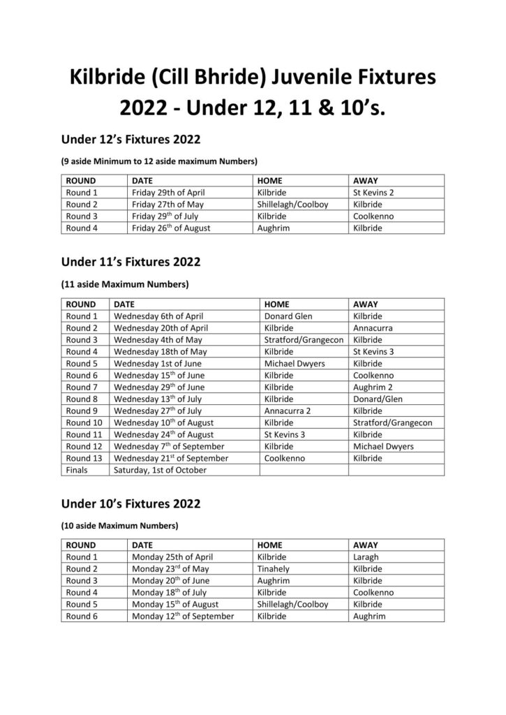 Annacurra Under 11’s will be the visitors to Kilbride on Wednesday the 20th of April for the first Juvenile Match on the New Pitch. Full Fixtures for the Under 10, 11 and 12 teams can be found at: https://www.kilbridegaa.com/downloads/ – and below.