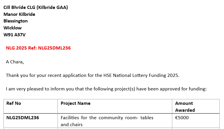 With the Community Room taking real shape…more good news, the Club have been awarded 5K from the HSE National Lottery Funding 2025 for tables and chairs…brilliant news.