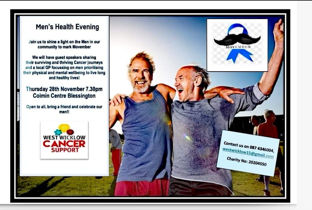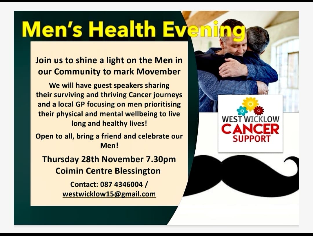 Hi, I work with West Wicklow Cancer Support. I just wanted to send a quick message to let you know we are hosting a Men’s health & wellness evening this Thursday the 28th of November in The Coimin Centre in Blessington at 7:30pm.