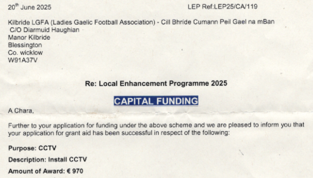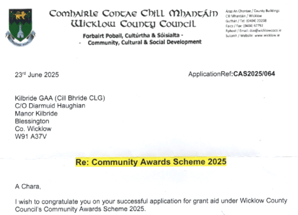 3 Grants obtained today from Wicklow County Council – €650 from the Community Awards Scheme and also €1000 from the Disability Club Development Grant Scheme 2025.