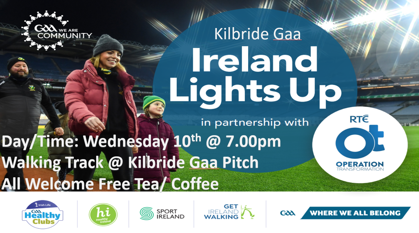 Following on from last weeks success, the Ireland Lights up Initiative in conjunction with RTE Operation Transformation will take place again tomorrow Wednesday 17th January at 7pm in Kilbride GAA. Last week Kilbride GAA welcomed up to 80 walkers, everyone is welcome and there is no pressure to do the full hour.  Complimentary Hot Chocolate, Tea & Coffee. Fruit & Water also available.