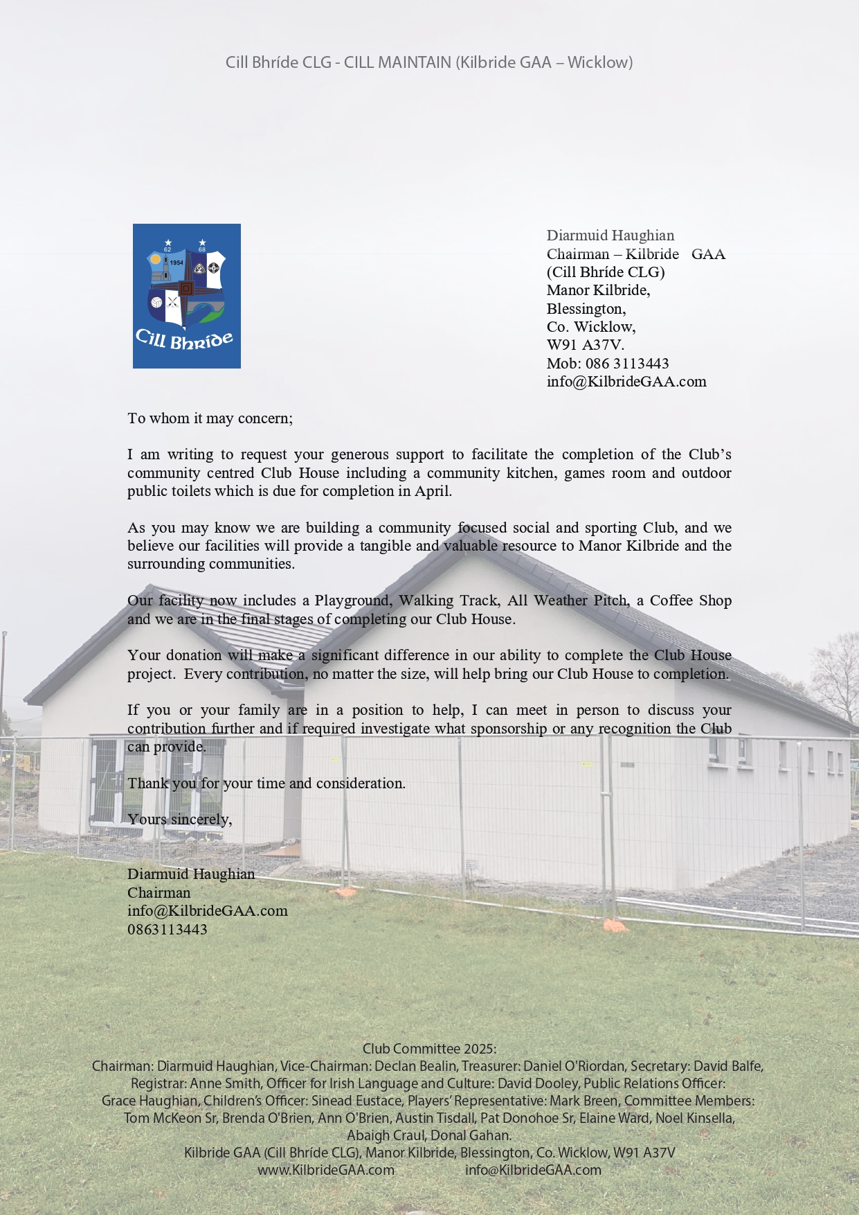 On top of that we also distributed a letter to every house in Manor Kilbride (see below) asking for donations in order to help complete the Club House and kindly over €8000 was donated the past couple of weeks. Thanks to Mary Murphy of the Banks who last week made a considerable donation and also to Feargal Donoghue of Boom & Platform Hire (https://www.bphire.ie/) who donated €5,000 yesterday. Thank you to the Murphy and Donoghue families. We will at a later date pay tribute to all our donors at the official Club House opening ceremony which we are planning for August.