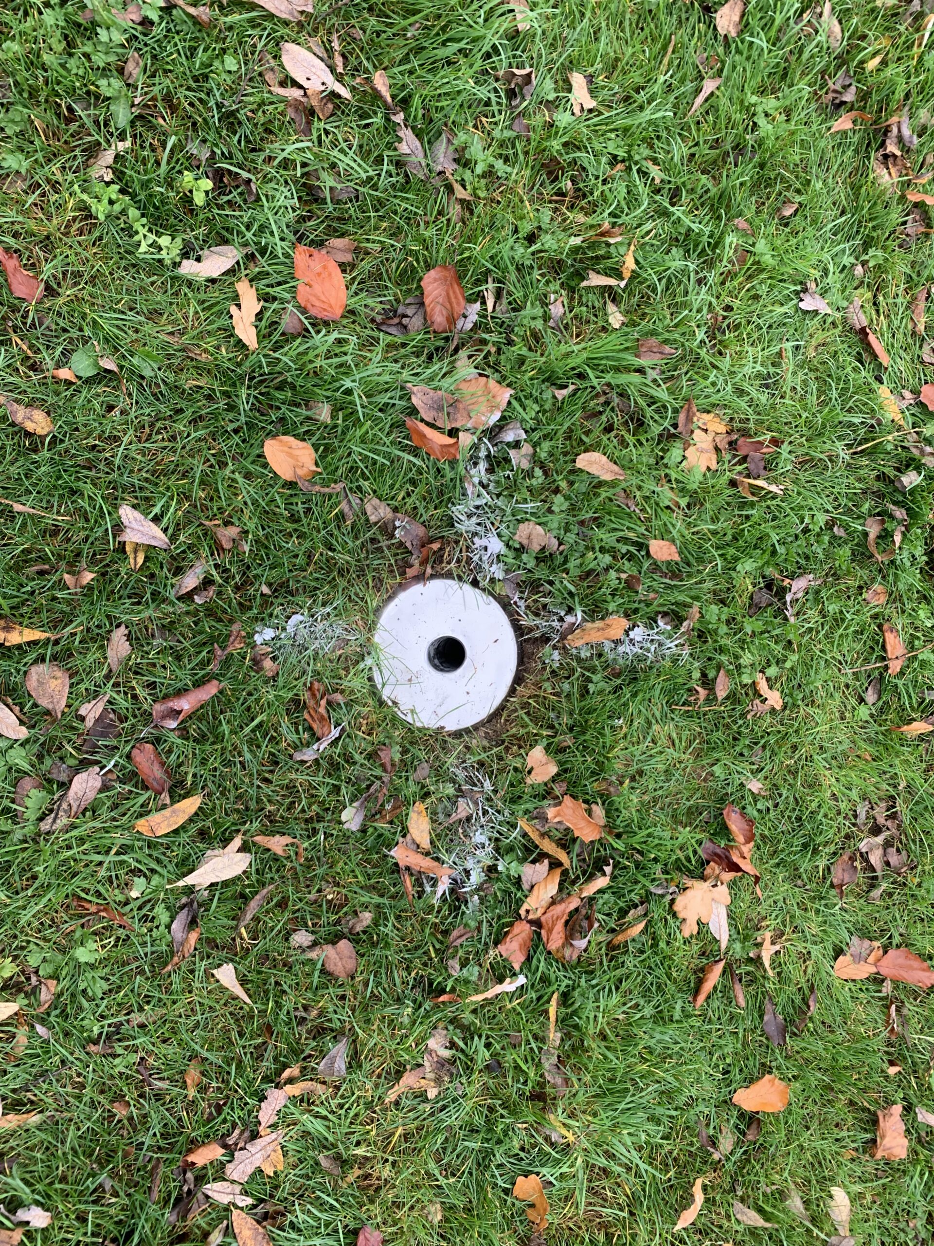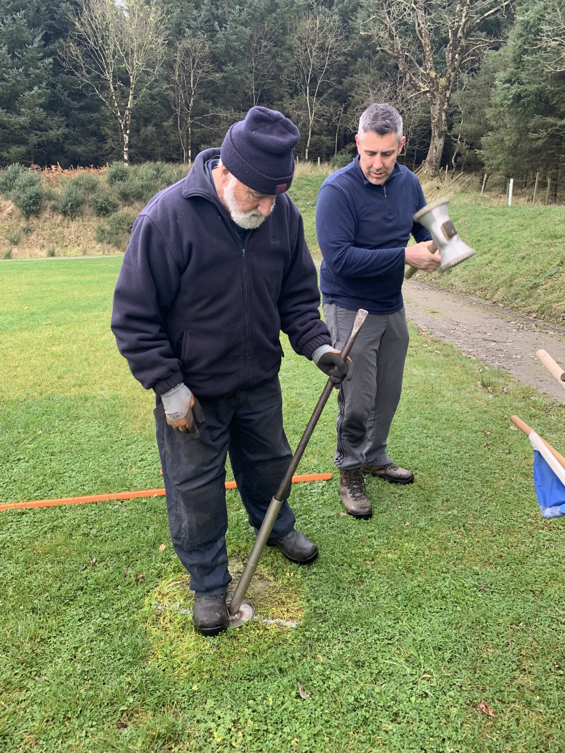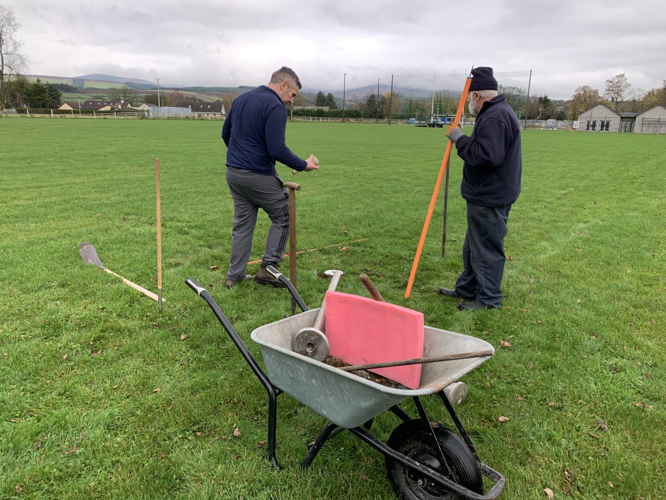 And on Saturday, Eddie Balfe put his talents to work, planting his custom made aluminium flag holders on each corner, 13, 20 and 45 and 65. They are at an angle for safety (flags are supposed to be at an angle in case a player falls on a flag, flags should not be a a 90 degrees) and positioned on the line. Thanks also to David Balfe for helping out. See photos.
