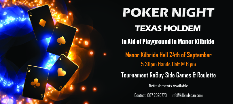 Poker Night in the Hall in Kilbride all in aid of Playground for Manor Kilbride – 24th of September 6PM ALL FUNDS RAISED ARE GOING TOWARDS THE PLAYGROUND FOR MANOR KILBRIDE Side Games, Roulette, Raffle and Foods & Refreshments all available on the night. Enquiries: email, info@kilbridegaa.com or contact Justin on 0872020770