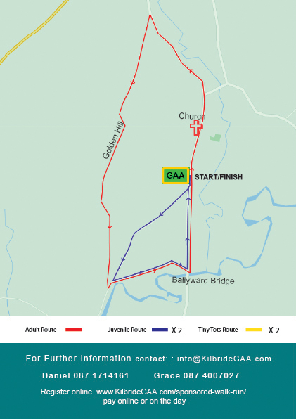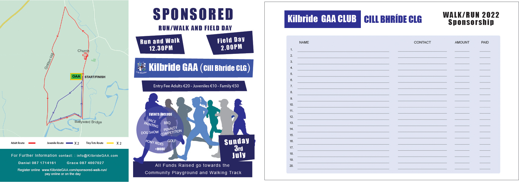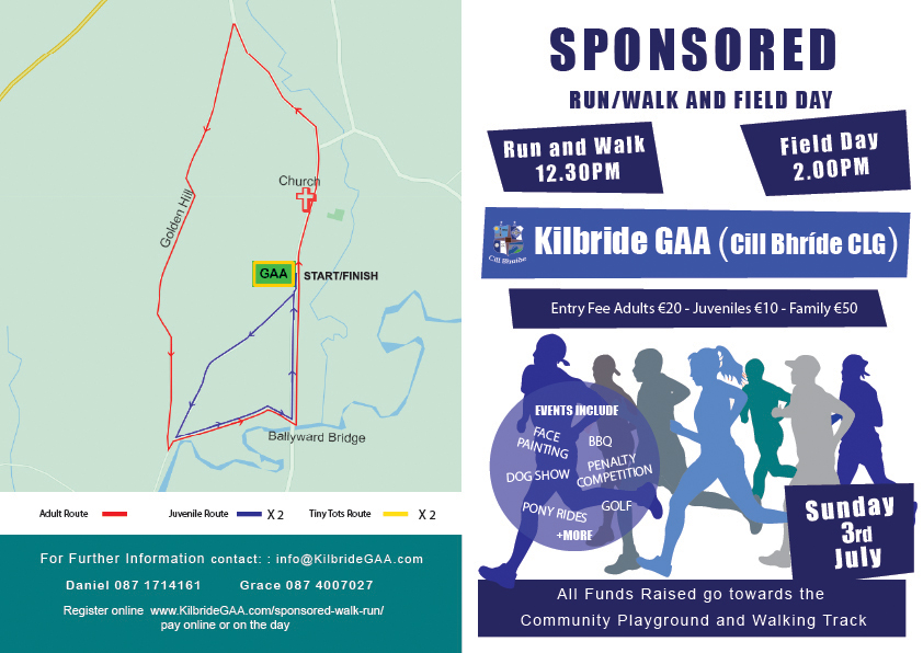 Registration is now open for the Sponsored Walk/Run around Manor Kilbride starting at 12.30, you can register and/or pay online (or on the day) @ https://www.kilbridegaa.com/sponsored-walk-run/ – you can also download Sponsorship Cards and the Route on this link (these will also be available at training and from committtee members). Also see graphics below which can be printed off.