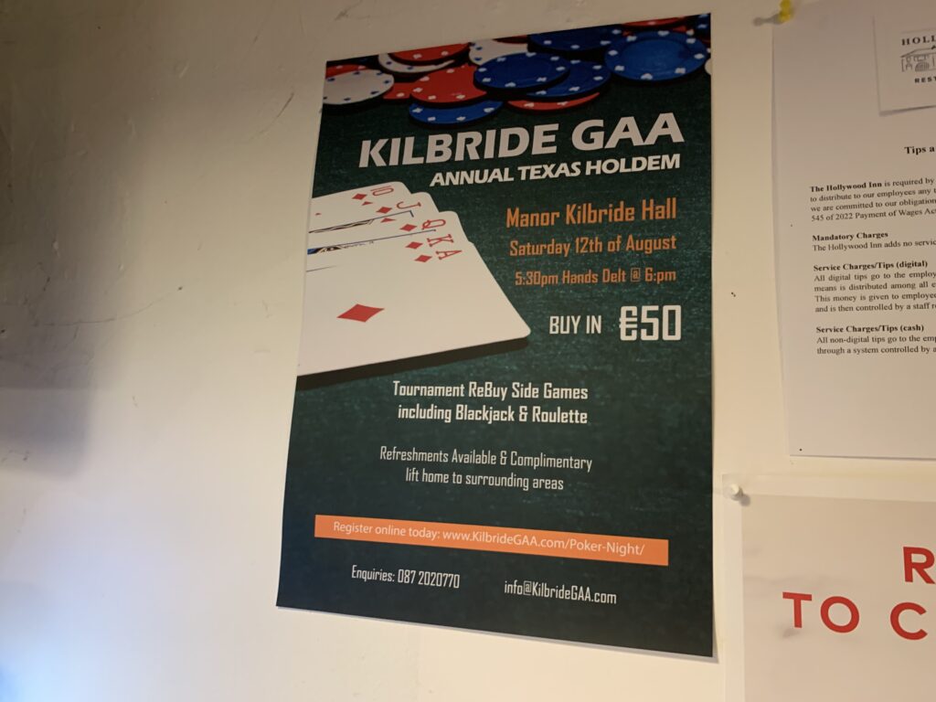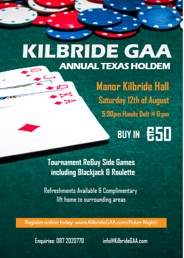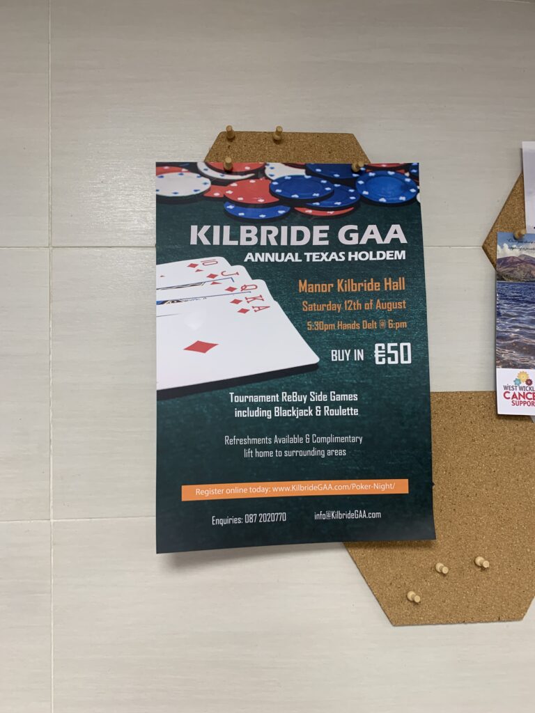 this Saturday in the Manor Kilbride Hall from 6PM, more promotional posters erected in Ballymore @ Paddy Murphy’s and Mick Murphy’s and in Hollywood…Tutty’s and The Hollywood Inn, Zellers in Lacken and also both Macari Chip Shops!! …..register today online: https://www.kilbridegaa.com/poker-night/